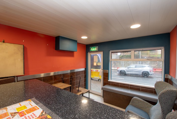 This is a partly fitted Hot Food unit at ground floor level, formerly trading as an Indian takeaway. It is finished to include solid floor with part tiled and part nonslip floor, UPVC double glazed shop front with roller shutter, PVC panelled walls and surface mounted fluorescent lighting.