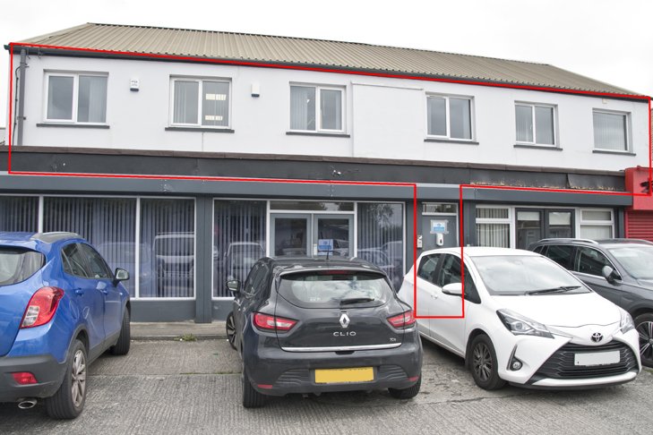 The subject unit is arranged as open plan waiting area, main office, two private offices, kitchen plus separate male and female W.C.’s. There is a shared concrete car parking area to the front. The unit is finished to include solid floor overlaid with carpet, plastered and painted walls, suspended ceilings, recessed and diffused fluorescent strip lighting, UPVC double glazed windows and OFCH.